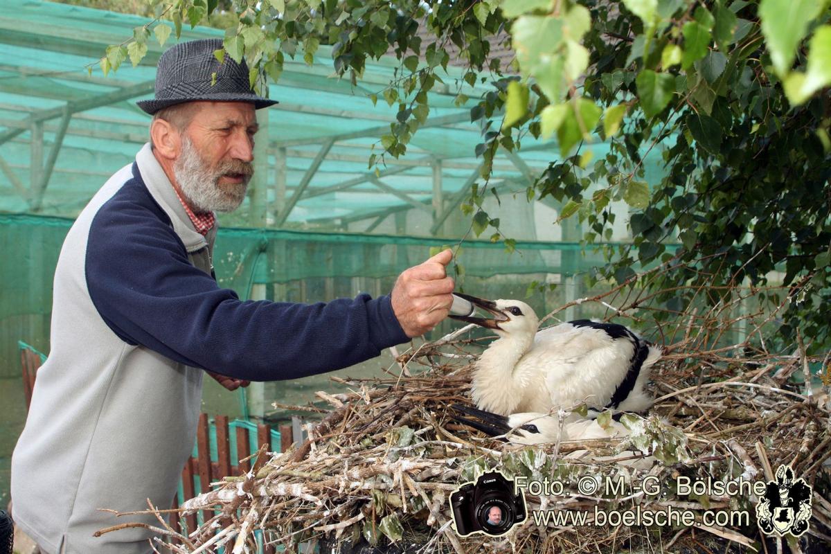 Bereits vor 19 Jahren wurde von dem gleichen Nest ein Tier gerettet und vom Schweriner Zoo in der Quarantänestation aufgenommen. Diesmal allerdings klappte es nicht mit dem Zoo, da am Mittwochnachmittag niemand telefonisch erreichbar war. So erinnerte man sich an Heinz Kriesel in Kläden. Er kennt sich mit verwaisten und auch verletzten Wildtieren aus, hatte er doch mit einem Verein einst eine Station für derartige Tiere betrieben. Er nahm das Tier auch sogleich in Obhut, reinigte den Schnabel und Schlund. „Mittlerweile ist das Tier wohlauf, es frisst, läuft umher und dürfte gute Chancen haben, ein gutes Storchenleben zu führen“, meinte Kriesel gestern Vormittag.