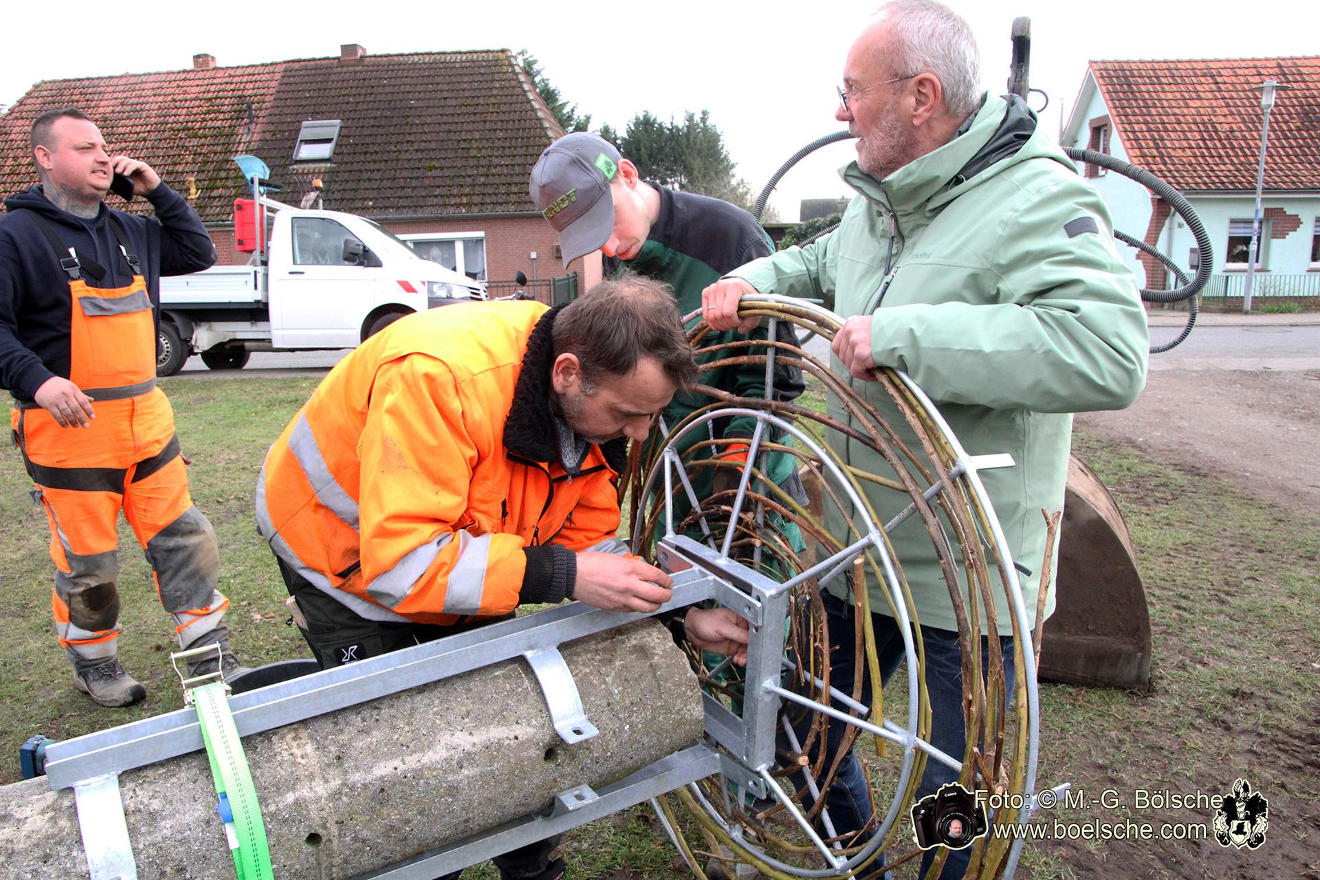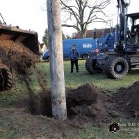 Nachdem das fast zwei Meter tiefe Loch ausgehoben war, wurde die Nestunterlage an dem elf Meter langen Betonmast befestigt. Auch diese Arbeit zeigte das gute Zusammenspiel der Mestliner, denn es gab Probleme. So passte die Halterung nicht richtig, es brach eine Schelle und die Schrauben waren zu kurz. Schnell war Abhilfe nötig und die kam durch das Schweißen und durch die Bereitstellung von Gewindestangen, durch die die richtige Länge für das Verschrauben der Halterung gefertigt werden konnte. Toni Thulke holte nach Absprache mit seinem Chef einen Radlader von der Agrar GmbH und so konnte auch das Loch wieder verfüllt und verdichtet werden.